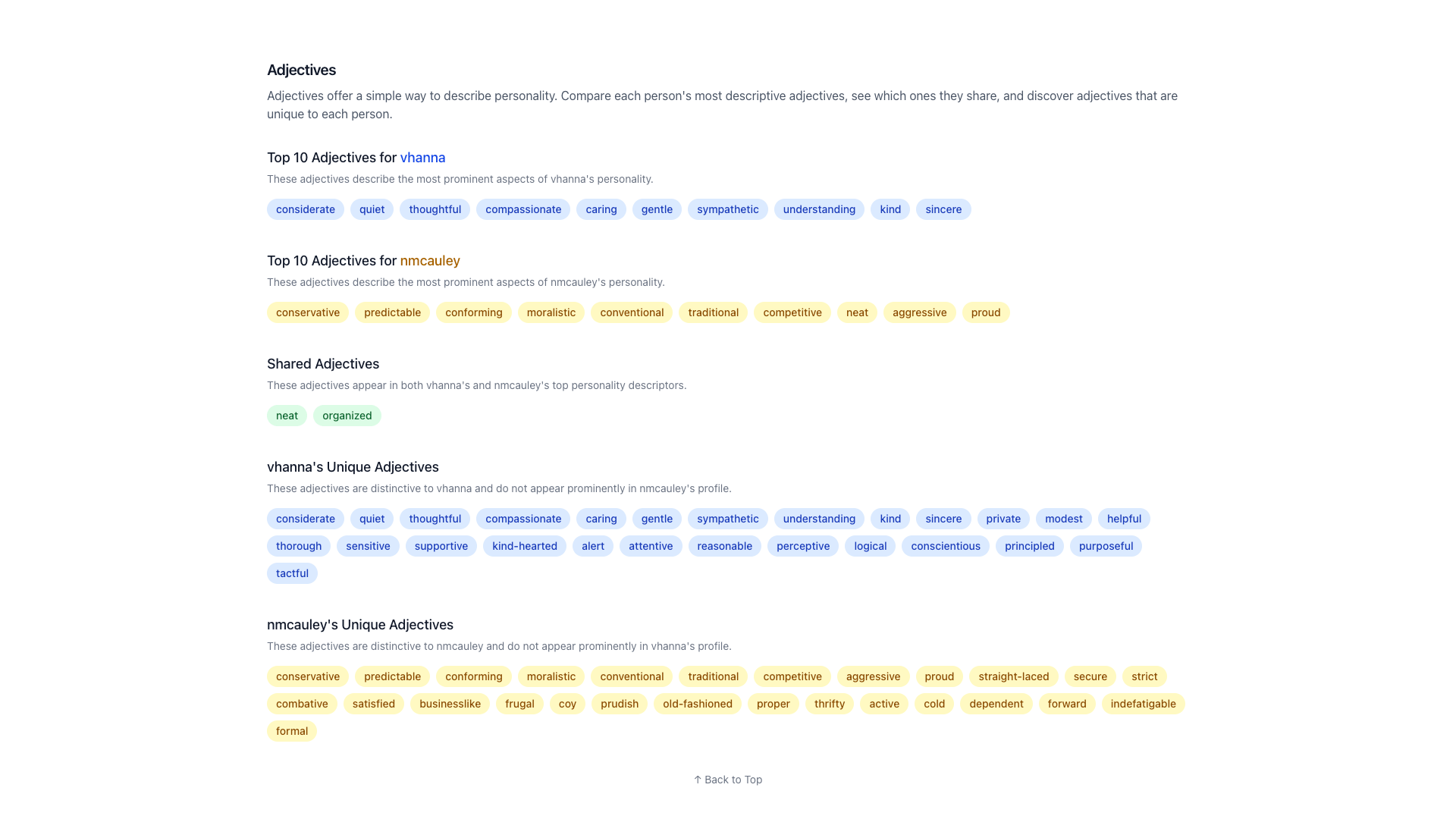 See which adjectives you share, which are unique to each person, and how strongly each adjective applies. This gives you a quick, intuitive sense of personality similarities and differences.