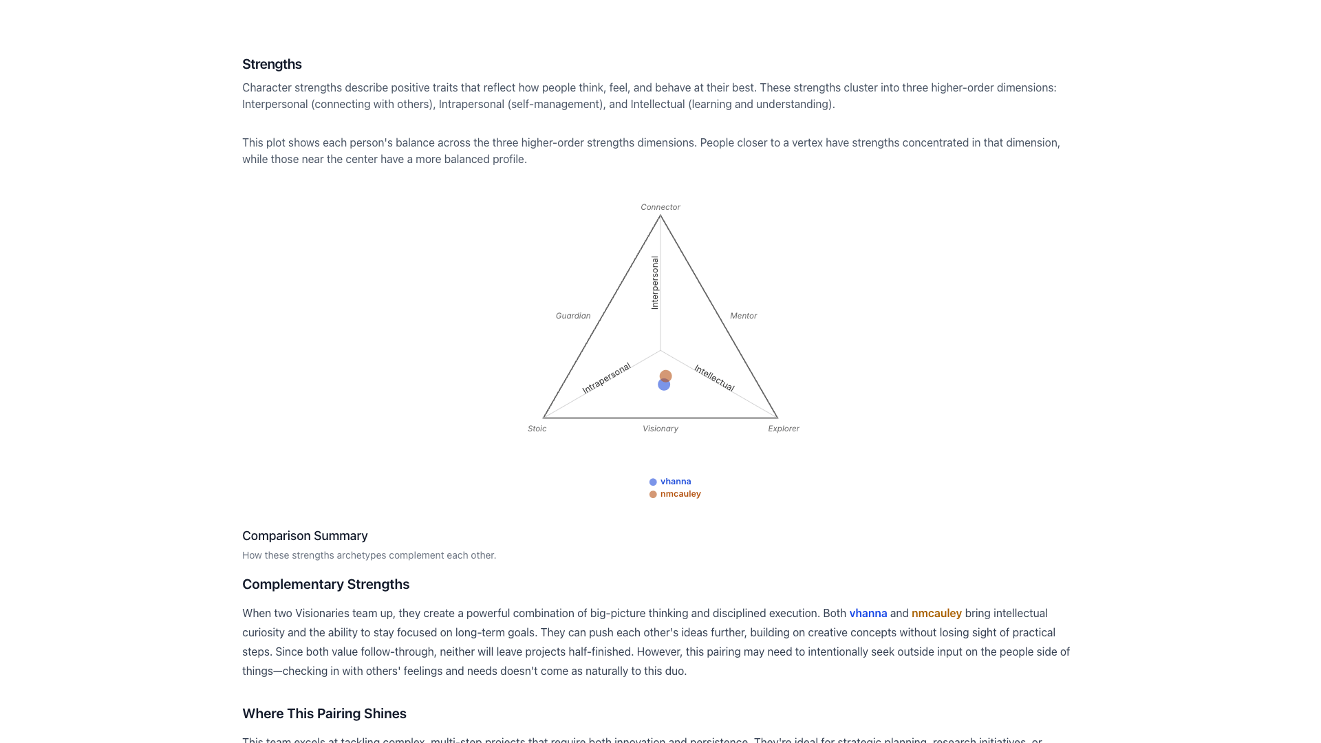 Strengths — Compare rankings across 24 character strengths and see how your strengths archetypes complement each other.