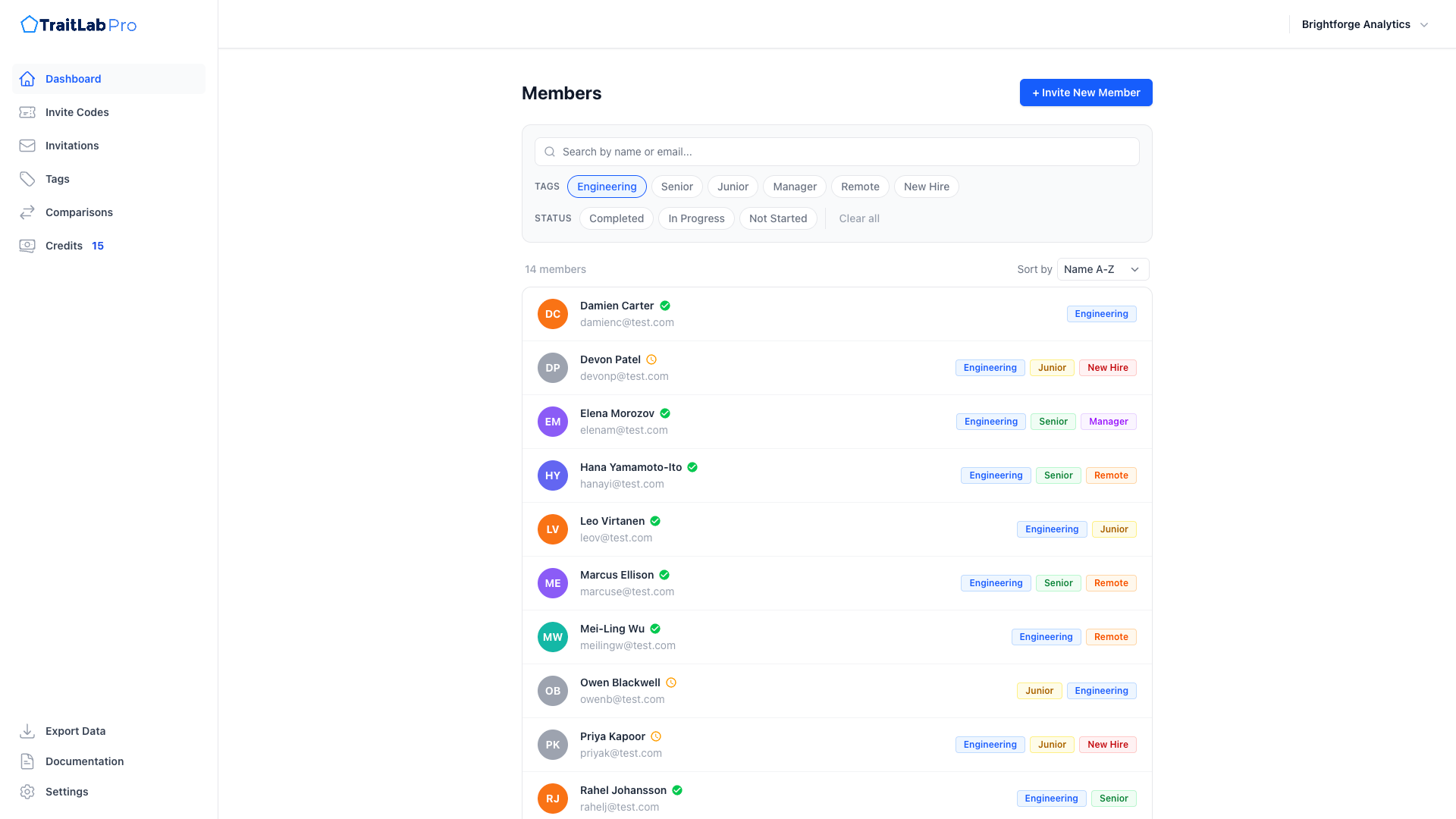 Setting up new team members or clients is a breeze with TraitLab Pro's intuitive team management. View member progress, review and export results, and create custom groups easily.